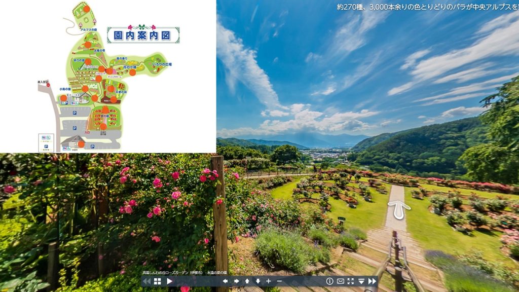 山の斜面の広大な敷地には、約270種、3,000本余りの色とりどりのバラが中央アルプスを望む830mの高台に咲き誇ります。