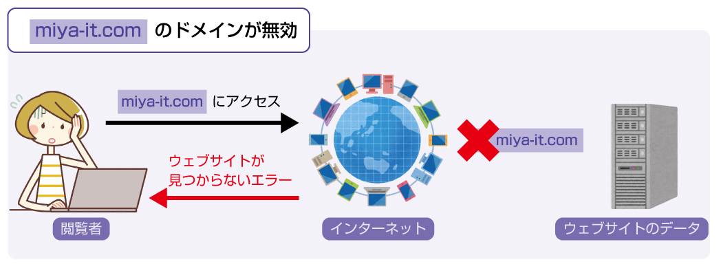 ドメインには有効期限があります。期限が切れるとドメインが無効となり、ウェブサイトのデータはインターネット上に残っていても、住所が無いのでサイトにアクセスすることができなくなります。これではウェブサイトの閲覧ができません。