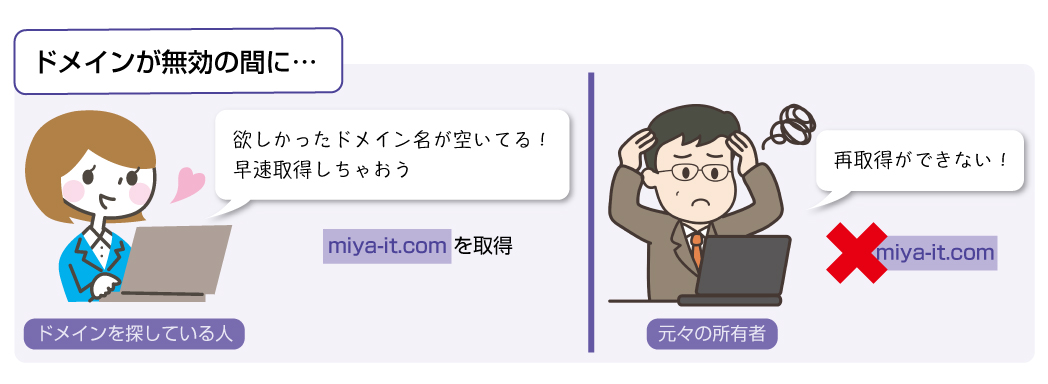 さらに、無効になっている間に第三者が今まで持っていた名前と同じドメインを取得してしまうと、もうそのドメイン名は取得することができなくなってしまいます。